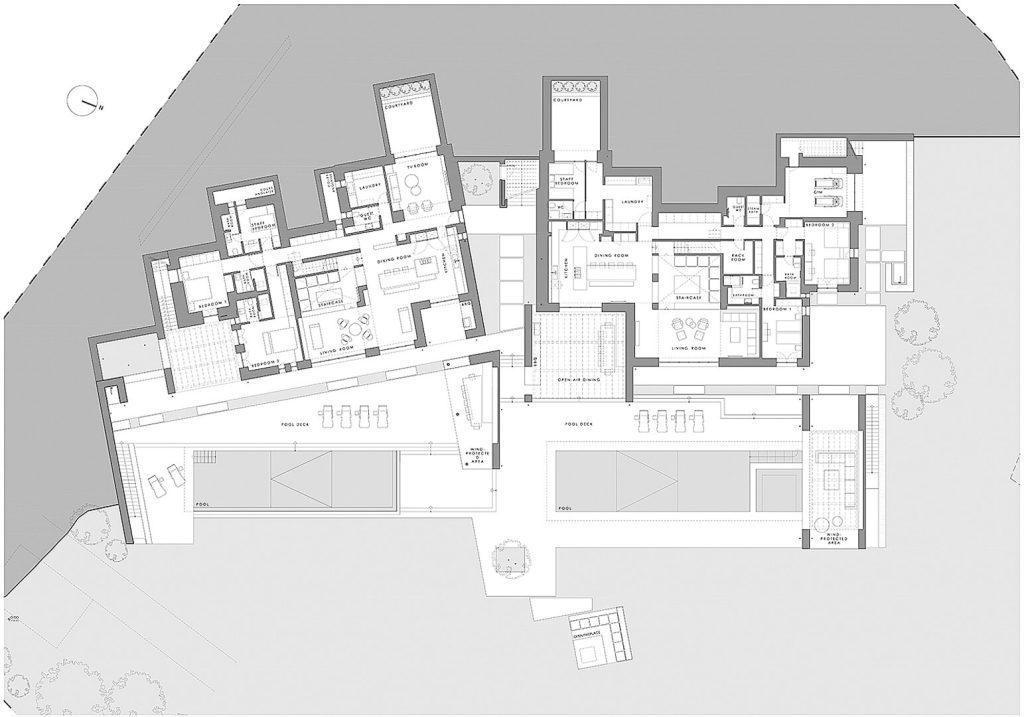 This beachfront luxurious 2-level property offers a unique architecture, landscaped gardens and two swimming pools. They key features are the paved road to the beach in front and the outdoor BBQ area.