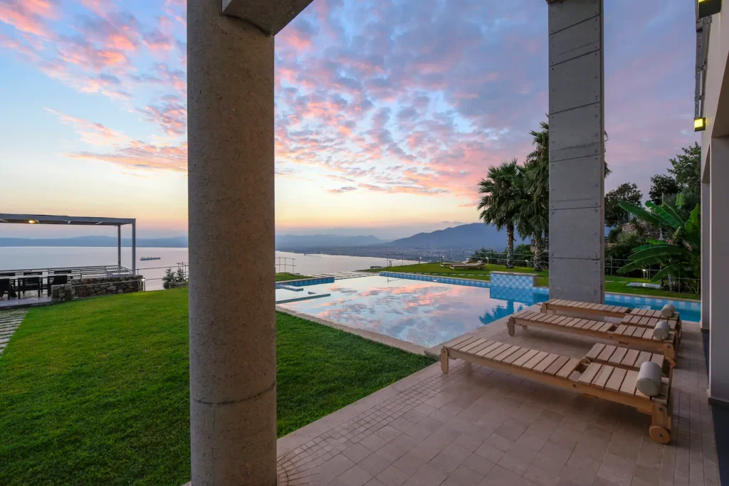 This two-floor, 420sq meter villa features a modern, minimal design with an indoor elevator and spacious outdoor area. The property also includes a sauna and a gym.