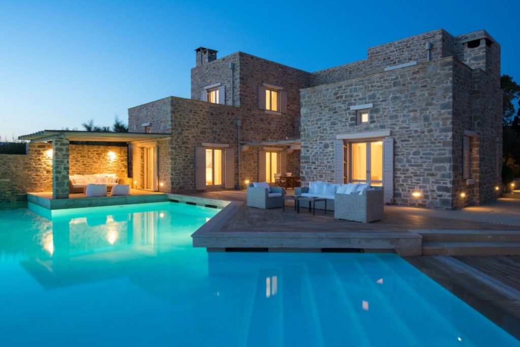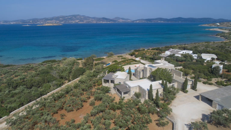 This stunning 546-square-meter stone villa in Paros features an additional 258 square meters of versatile space. Key features of the property are the ample outdoor space and the guesthouses.