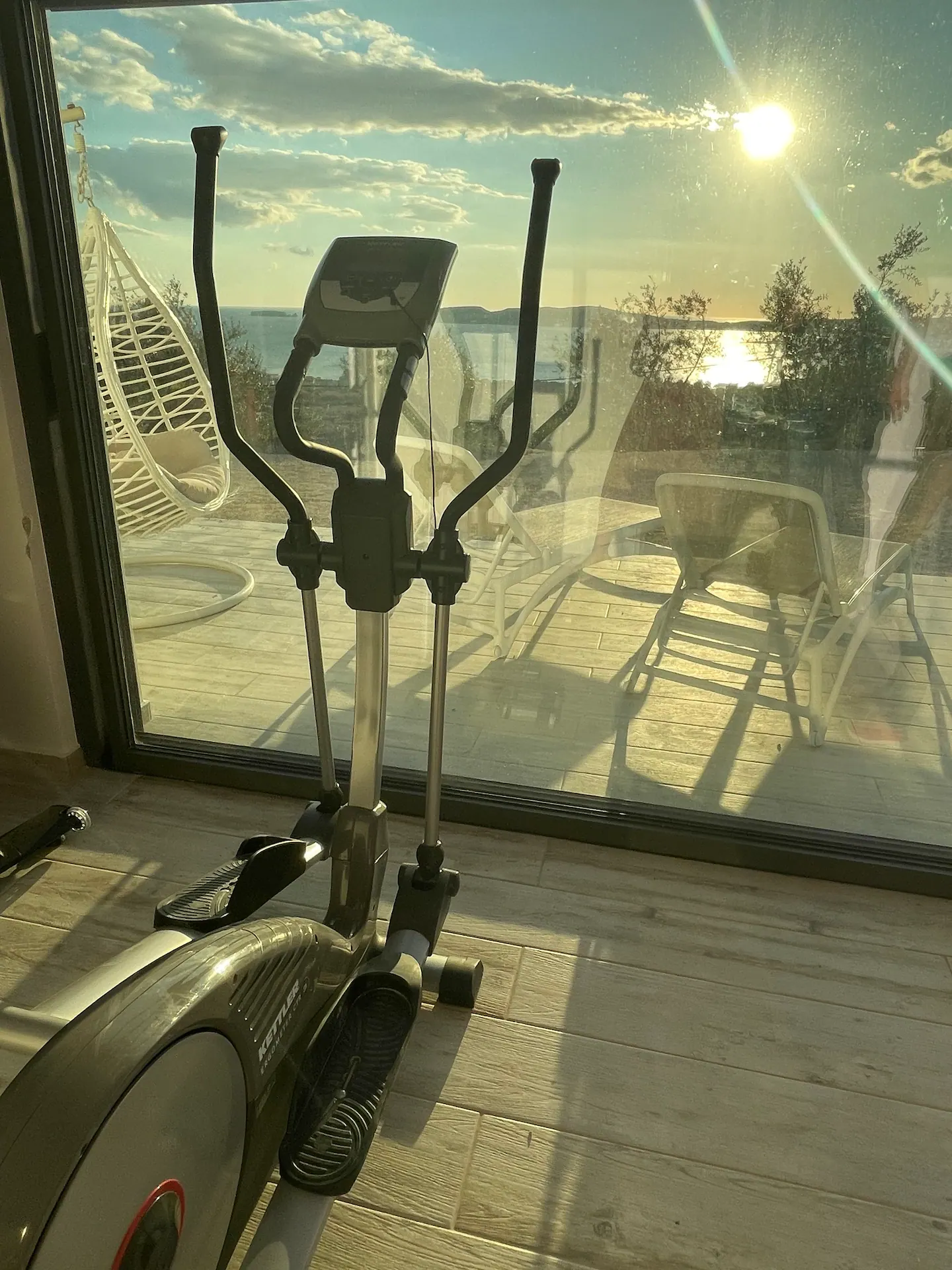 This 2-level, 465sq meter villa is set on a spacious plot featuring a private olive grove and its own spa. The outdoor kitchen and dining area provide a versatile setting.